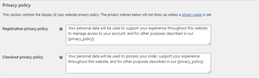 Privacy Policy allows you to set up registration privacy policies. It accesses you to add optional text to be displayed on the Registration page. Similarly, you can also add text for the checkout privacy policies field as well as a link to your page privacy policy page for more information about your website. WooCommerce by default has filled some sample text on both these fields, you can change on desire.
