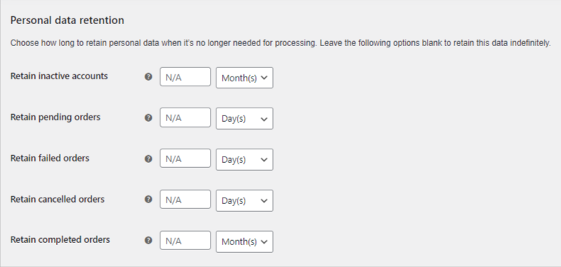 Woocommers gives options to specify the duration you want to retain the personal data of customers. Here, you will see 5 different settings: personal data for inactive accounts, pending orders, failed orders, canceled orders, and completed orders. For each option, enter a number and choose the duration from days, weeks, months, or years.