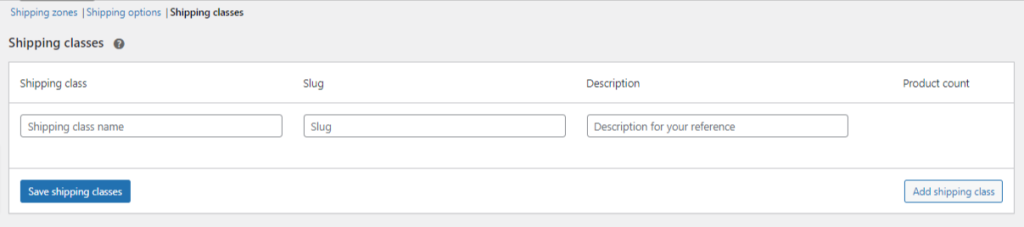 Woocommerce shipping class is just a way of grouping products using the same method. To add shipping classes click on Add shipping classes on the right screen. Also, you can add a name, slug and description to the shipping classes.