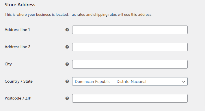 Firstly, you have to set up your store location. Where is your physical store located? Locate the store’s country/state, city, or full address including a zip code. Tax rates and shipping rates use this location.